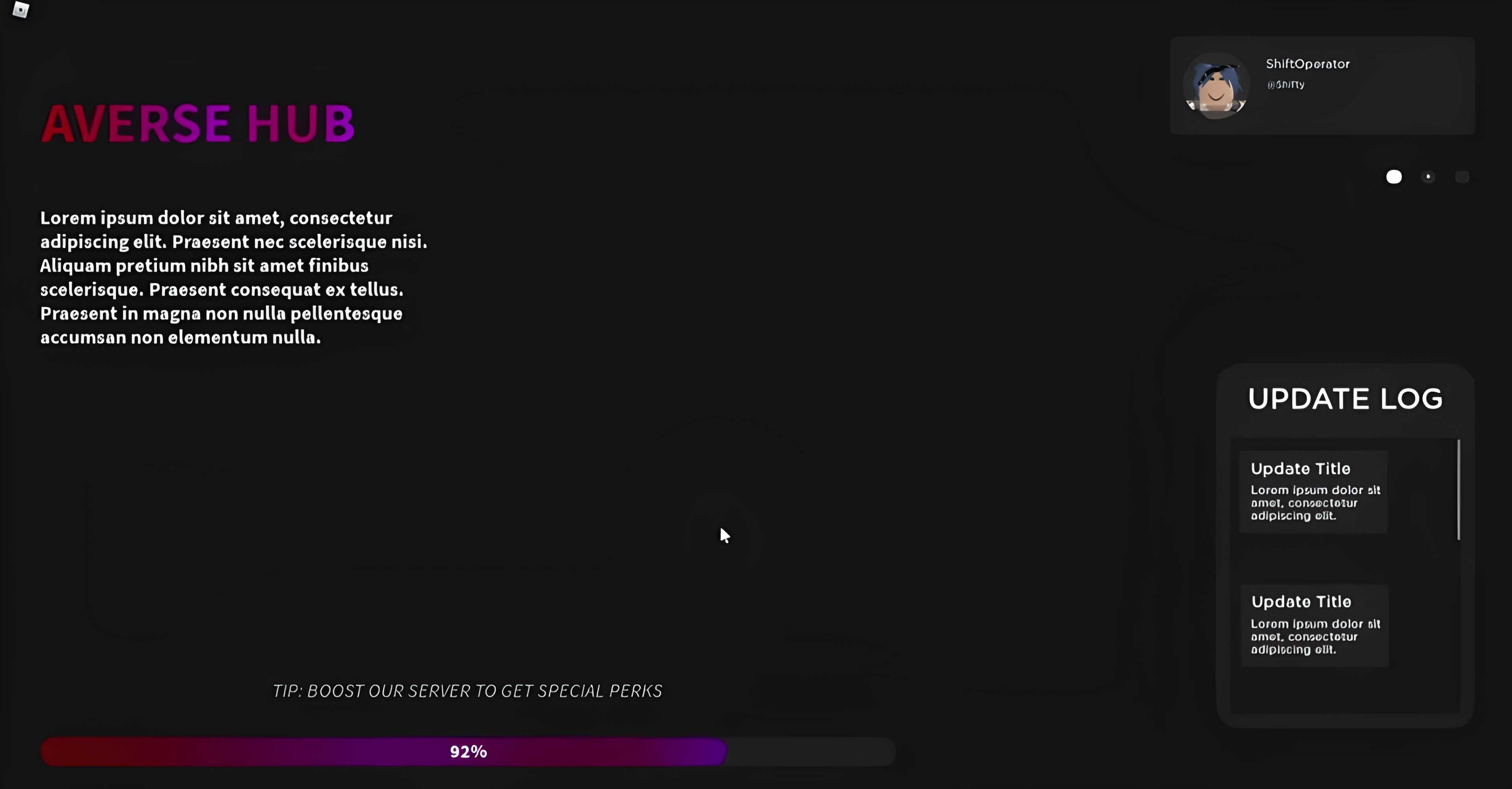 Positioned as the first touchpoint players see, Advanced Loading Screen delivers a clean and informative transition into gameplay. The system displays group name and description alongside a profile interface and update log to communicate key information while content loads. A visual loading bar provides clear progress feedback, improving perceived flow and reducing wait frustration. Fully scripted and structured for clarity, the interface integrates smoothly into existing projects and remains flexible enough to match different game themes and visual styles.