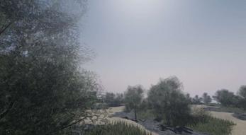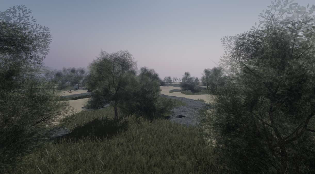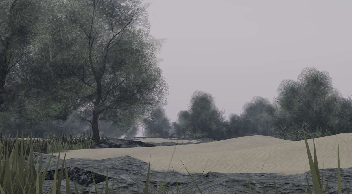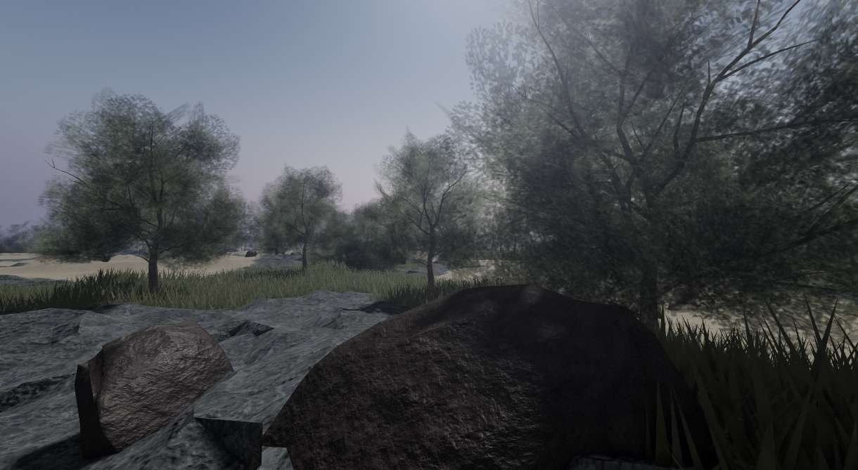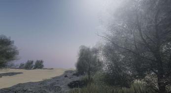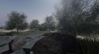 The terrain features a flowing river, dense trees, scattered rocks, and bushes — all crafted to create an immersive and realistic atmosphere.
