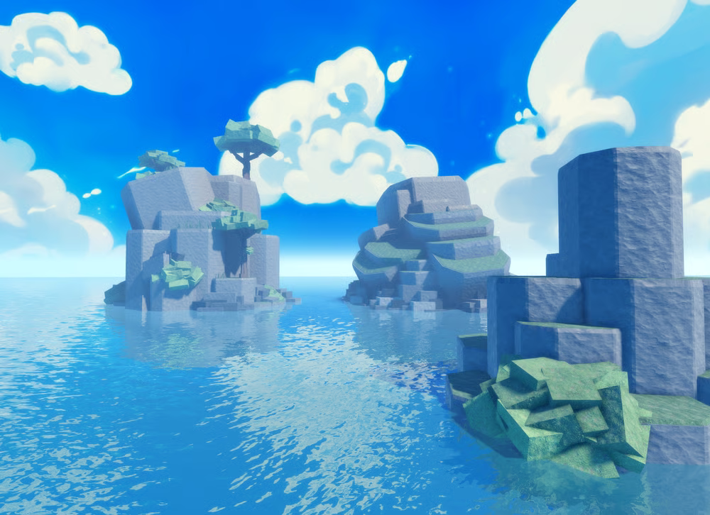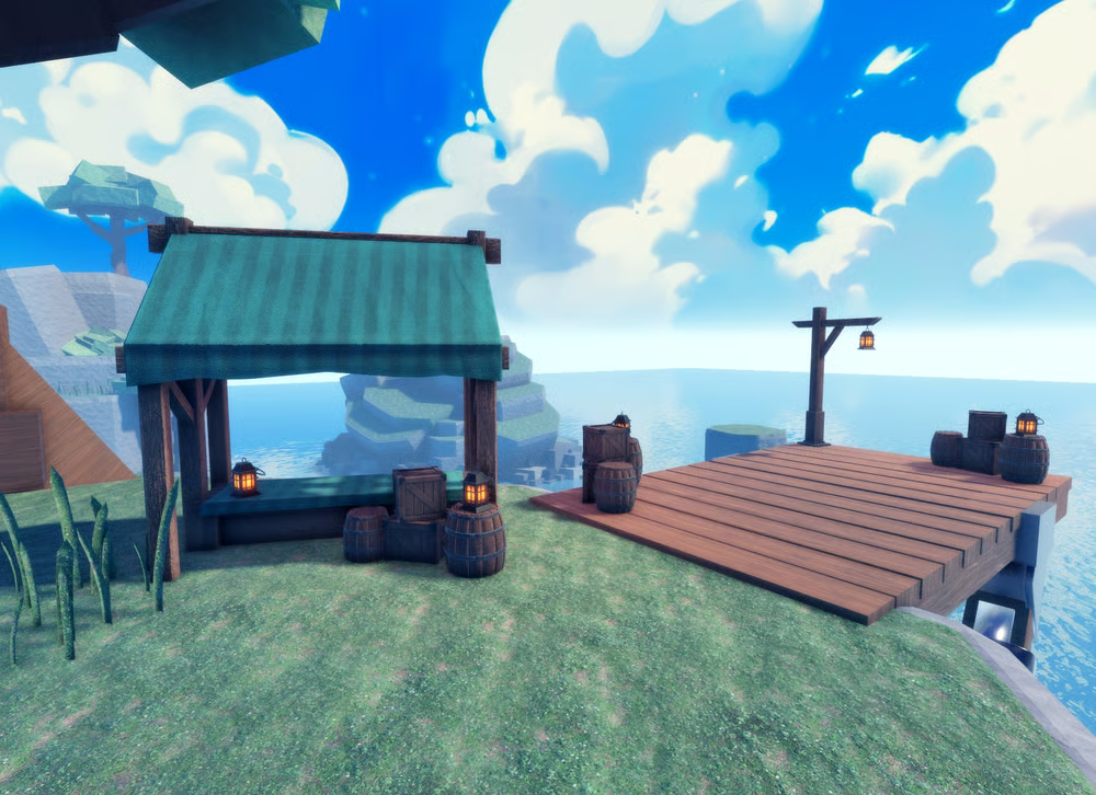 A winding path connects the pirate home to a lower-level dock area, where a wooden pier extends out over the ocean, flanked by barrels, crates, and hanging lanterns that suggest trade or supply activity. Beside the pier is a small market stall under a green canvas awning, adding life and functionality to the harbor area. A large wooden water wheel is attached to the cliffside below, giving the scene a sense of movement and mechanical utility. In the distance, several smaller floating islands rise from the ocean, made of tiered stone and topped with minimal foliage, inviting players to explore. The lighting is warm and saturated, with large, fluffy clouds and deep blue water reflecting the sky, creating a serene yet adventurous atmosphere perfect for a pirate or exploration-themed game.