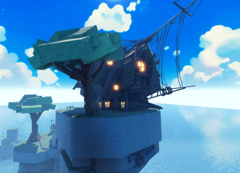 This map is a vibrant, stylized 3D environment set in a bright, whimsical ocean world, featuring a main floating island that serves as a central hub. At the highest point of the island sits a large, ship-inspired pirate house, complete with glowing windows, angled wooden panels, and nautical rigging that suggests a past life at sea. The surrounding terrain is built from layered stone platforms with soft grassy textures, dotted with angular, low-poly trees and stylized vegetation.