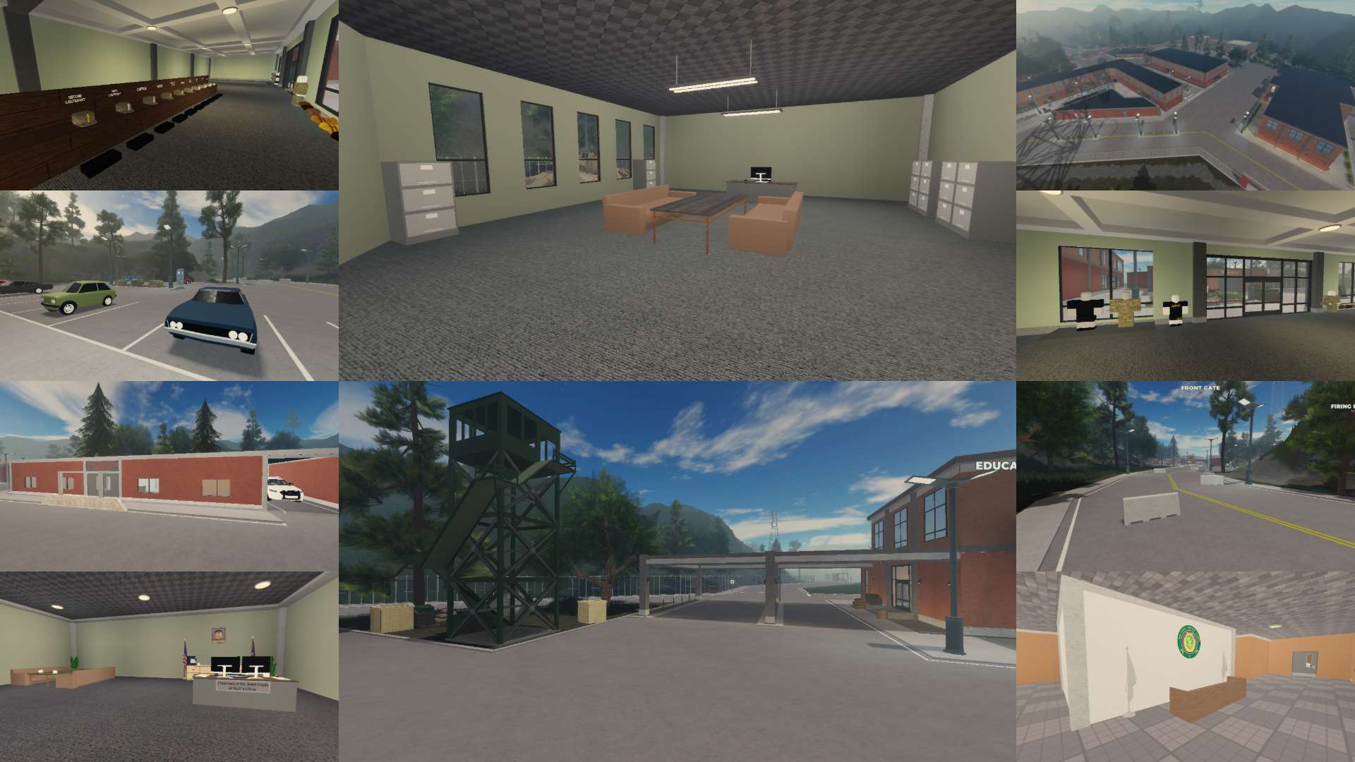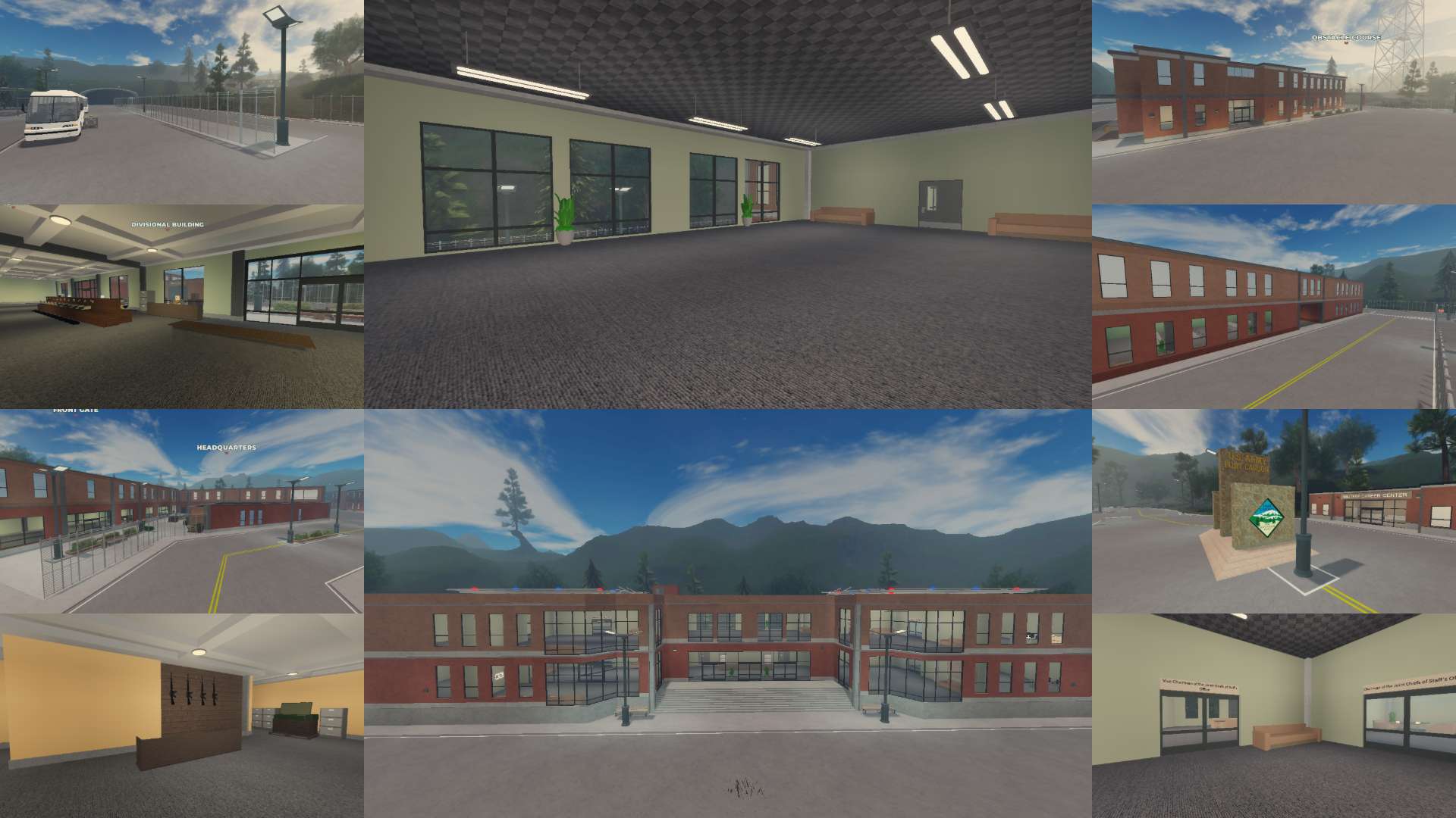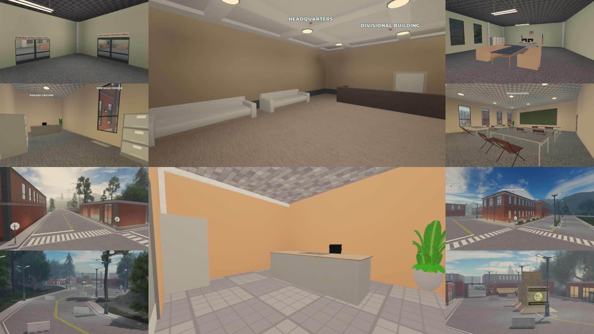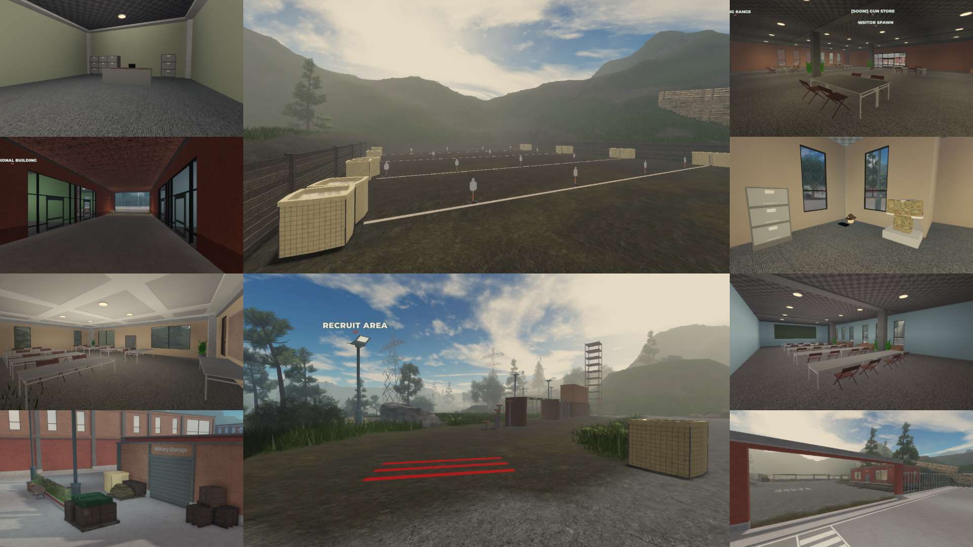 Players can explore key areas such as a parade square, Marshal HQ, headquarters, visitor center, military exchange, uniform rooms, storage areas, and a gun shop. Training-focused facilities include an obstacle course, firing range, and a fully equipped military training facility.