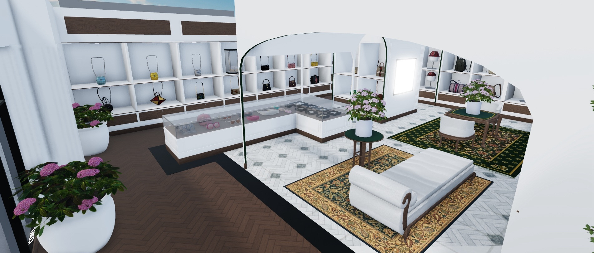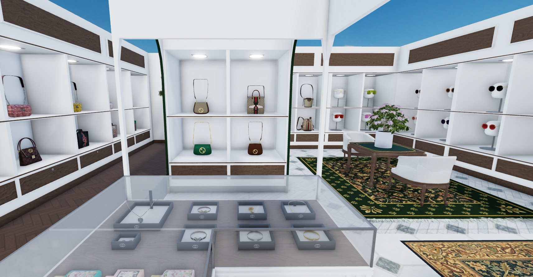 Gucci Store delivers a refined retail space combining detailed interiors with landscaped exterior elements. High quality lighting and textures highlight displays while maintaining a premium atmosphere. Nature detailing around the exterior adds visual depth and contrast. The interior layout supports roleplay interaction and brand focused storytelling. Fully customizable components allow creators to adapt the store for different luxury themes or city districts.