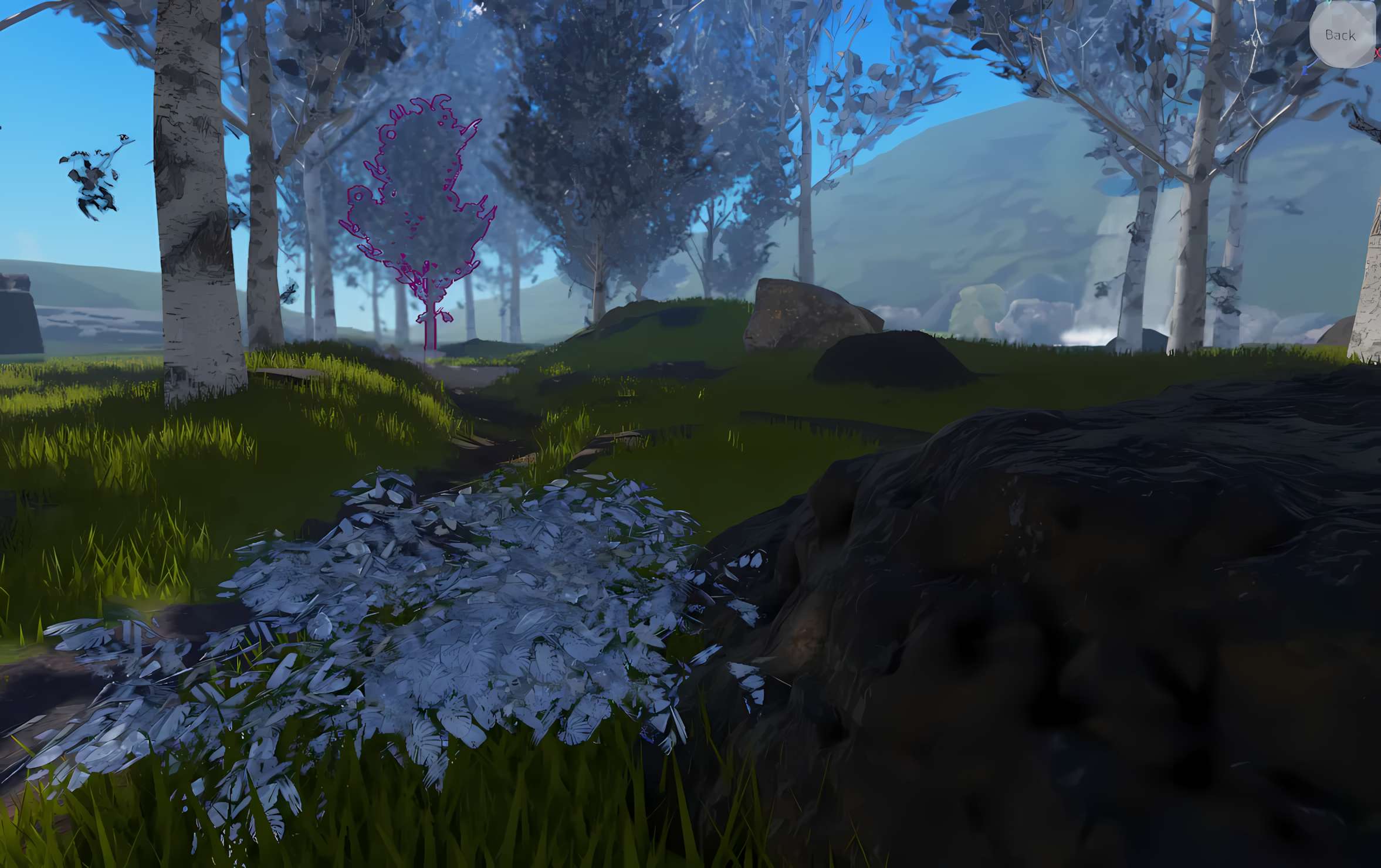 Large spread out central forest, mated to a dense white forest designed to be a "spooky foggy forest" with a centralized waterfall (in the white forest).